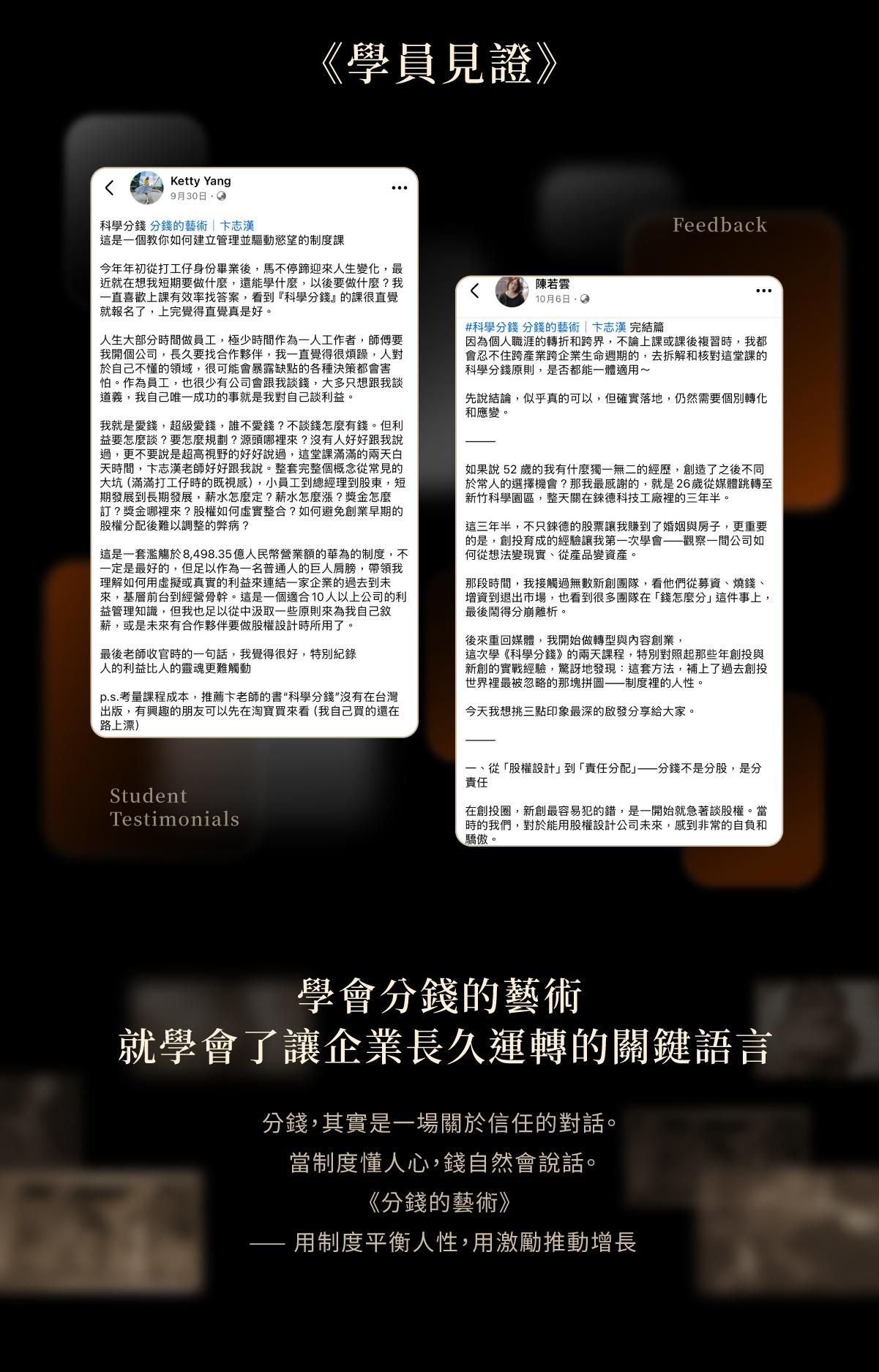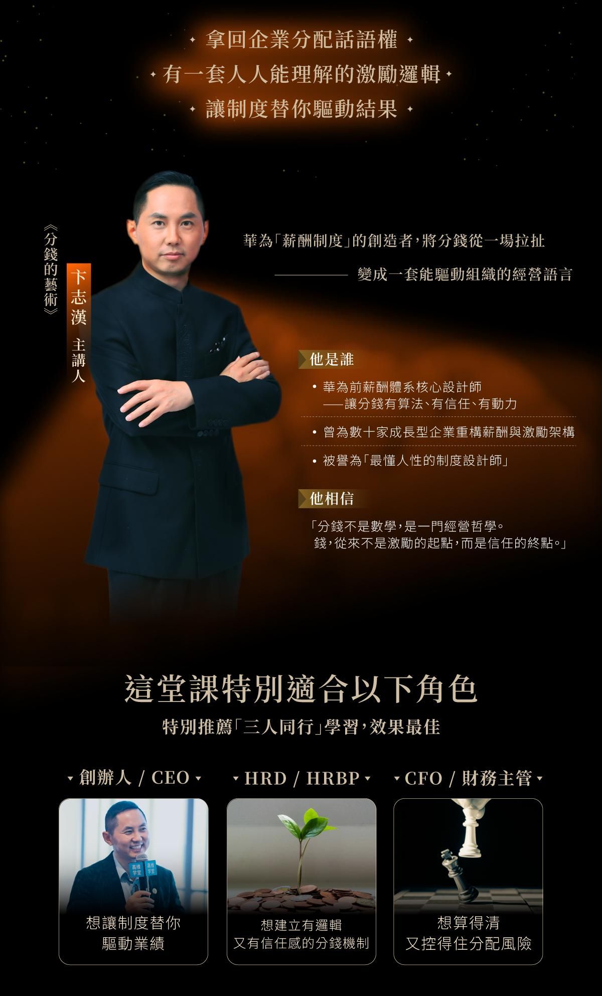 這不只是一門「怎麼分錢」的課,而是一套可落地的組織活力解決方案。無論你是企業主、管理者或創業者,都能從中找到可實際運用的工具與方法,讓錢分得更科學,讓人心更凝聚,讓企業走得更遠。